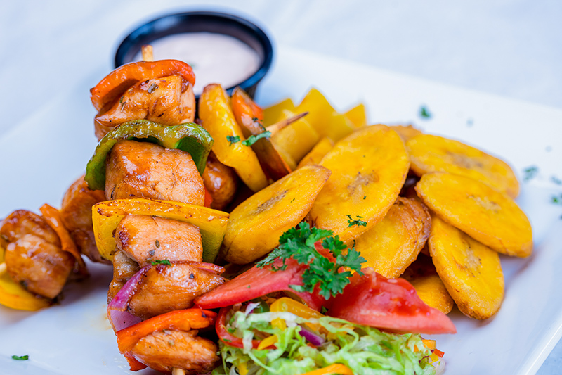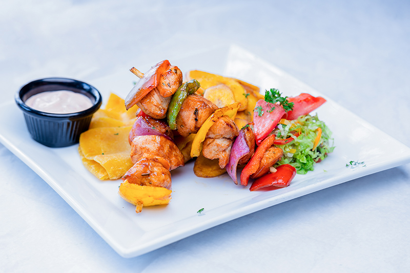 Grilled chicken chunks on skewers with bell peppers, served with a choice of accompaniment.