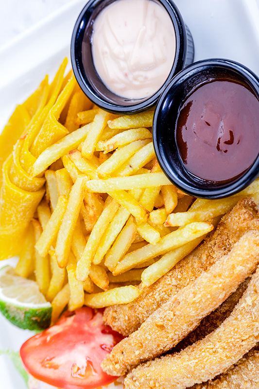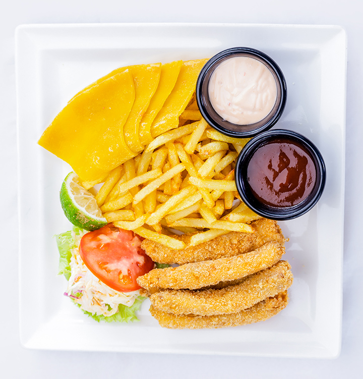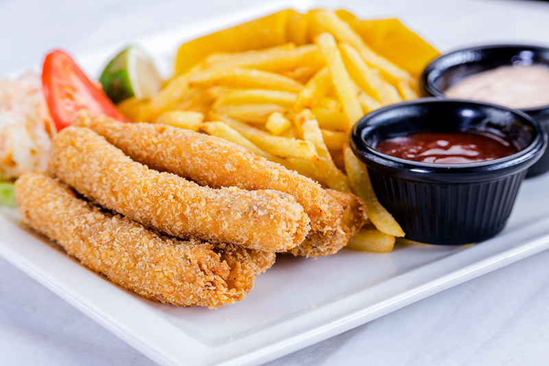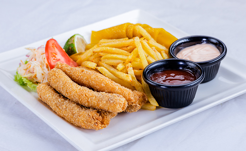 Well-prepared fish fingers served with choice of accompaniment and tartar sauce.